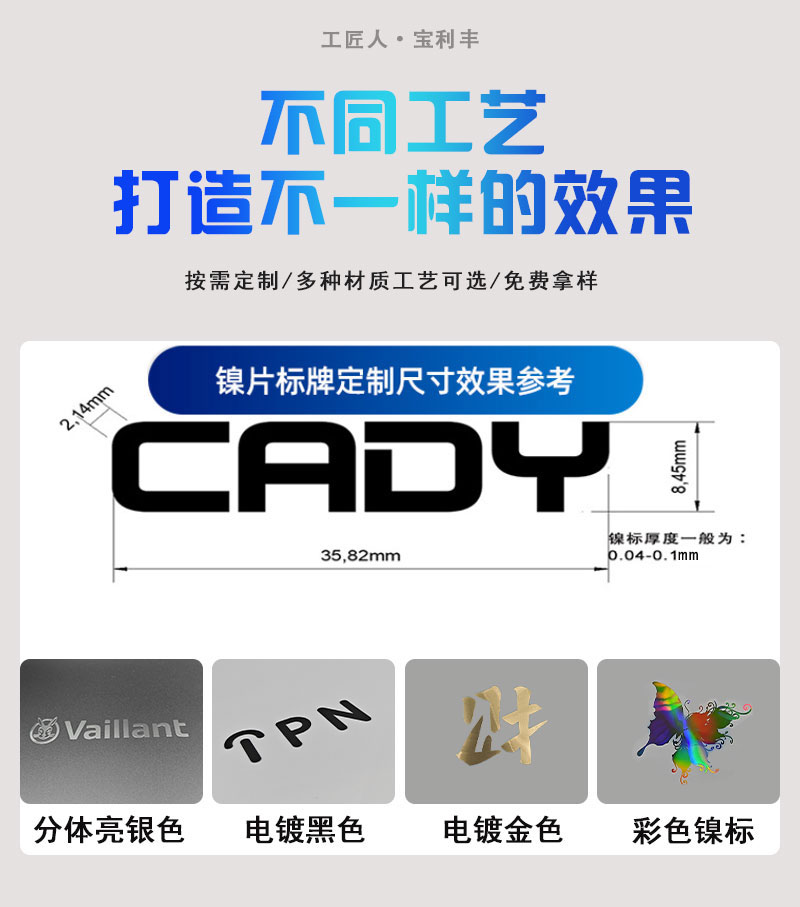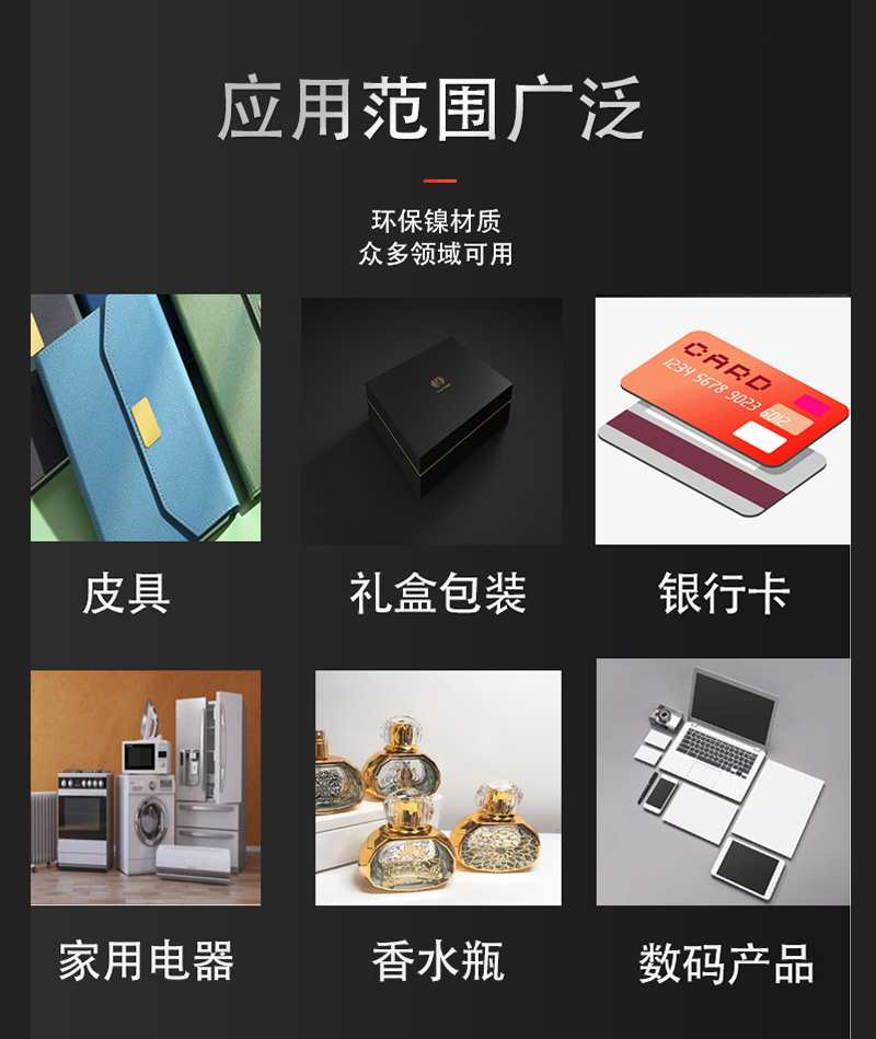 電鑄金屬鎳標牌適用于3C數碼產品、電子產品、家電家具、皮革包包、包裝行業、汽車行業、酒包裝、香水行業、包裝禮盒等,應用領域非常廣泛,歡迎有需要的老板咨詢我們。