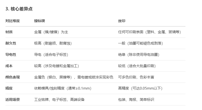 鎳標牌和絲?。ńz網印刷)是兩種完全不同的工藝,用途、制作方式和最終效果都有顯著區別。以下是它們的核心差異對比: