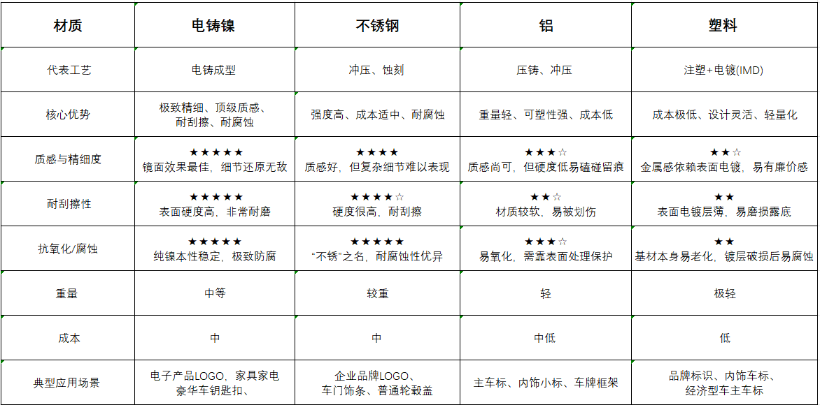 不銹鋼:是 “性價比實力派” 。綜合性能優(yōu)秀,成本可控,是大多數(shù)汽車外部主車標(biāo)最可靠的選擇,堅固耐用。